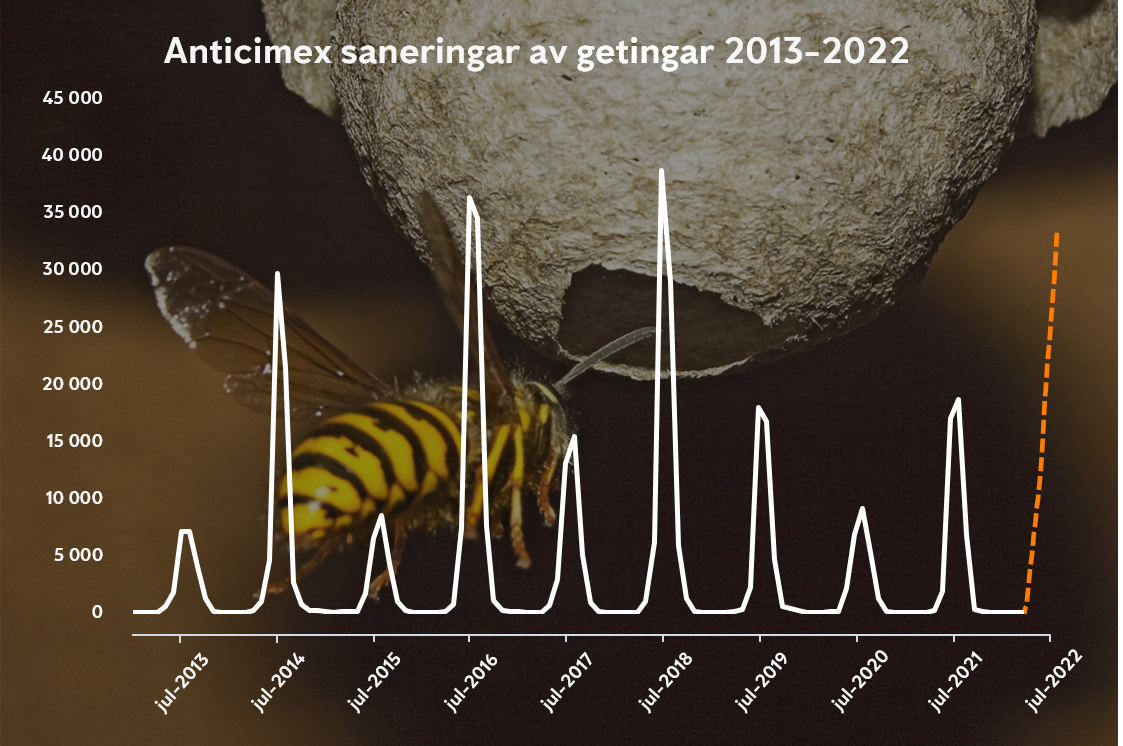 I sommar blir det fler getingar jämfört med förra året, förutspår Anticimex. Vartannat år brukar historiskt bli ett getingår, men mönstret bröts 2020 som inte blev den getingsommar som förväntat. Att det skulle bli få getingar för fjärde året i rad bedömer Anticimex som otroligt, och förbereder sig nu för en getingsommar. Husägare rekommenderas att själva getingsäkra sitt hus under våren för att minska besvären med de stickande insekterna i sommar.